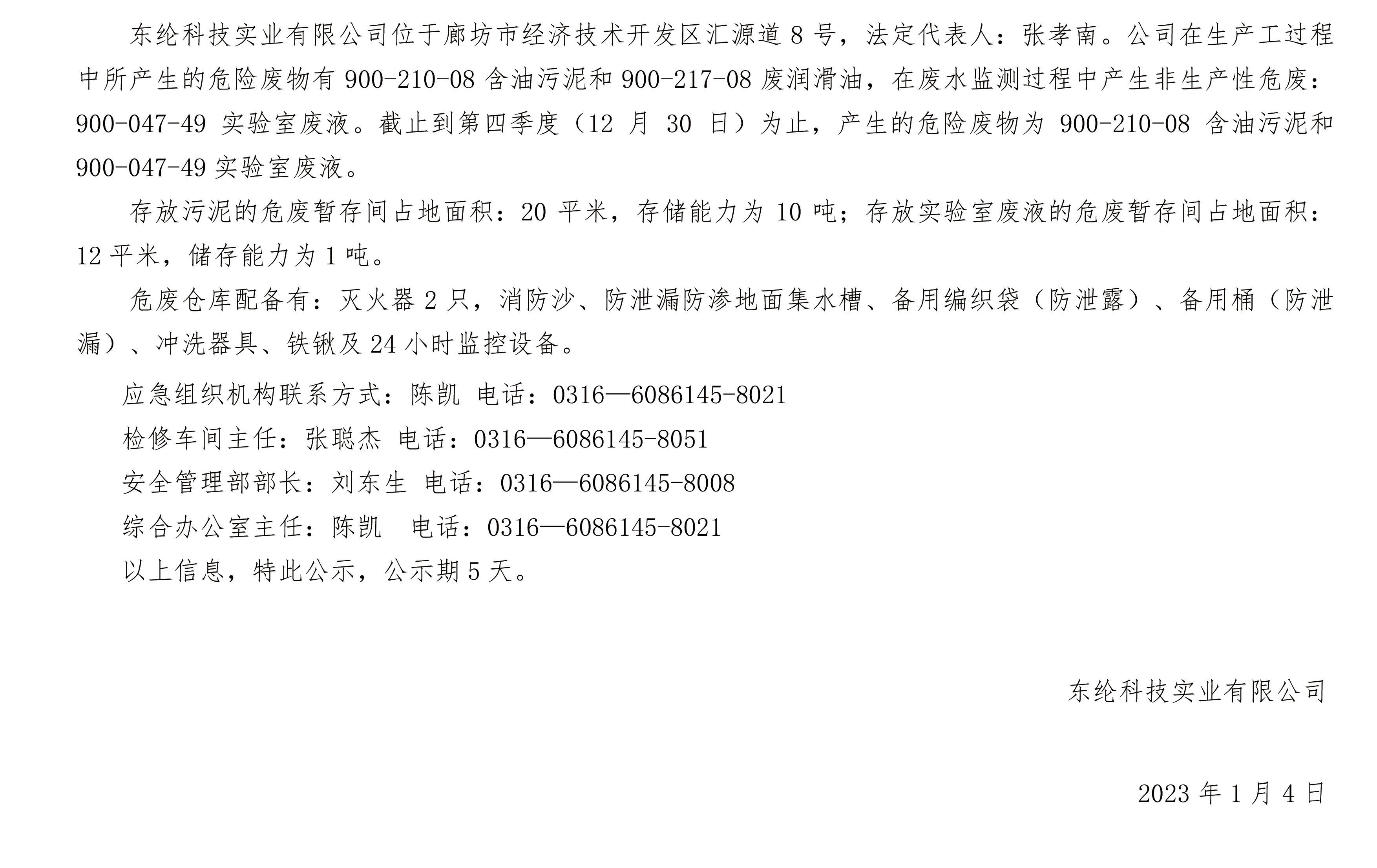 東綸科技實業有限公司位于廊坊市經濟技術開發區匯源道8號,法定代表人:張孝南。公司在生產工過程中所產生的危險廢物有900-210-08含油污泥和900-217-08廢潤滑油,在廢水監測過程中產生非