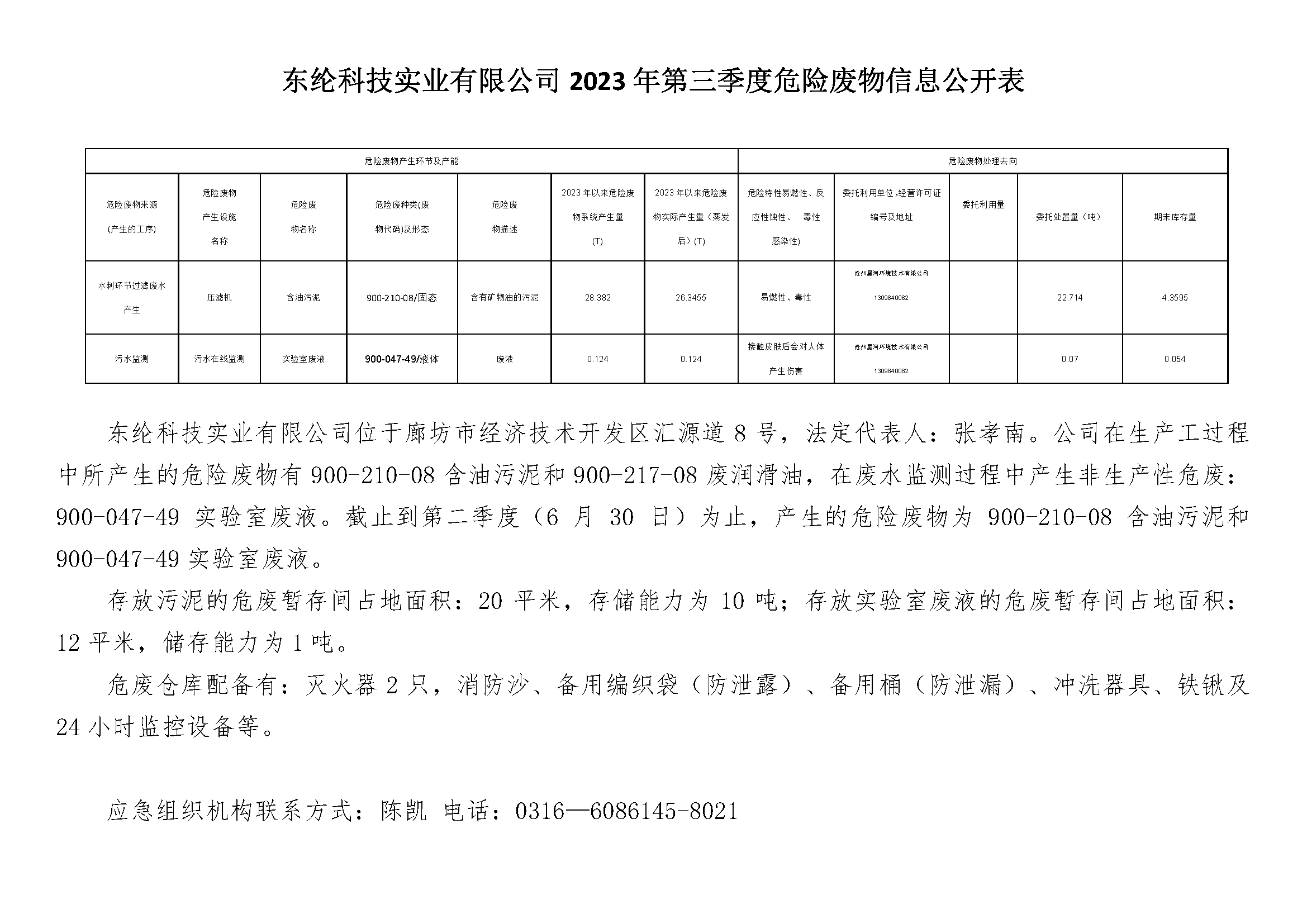 公司在生產工過程中所產生的危險廢物有900-210-08含油污泥和900-217-08廢潤滑油,在廢水監測過程中產生非生產性危廢:900-047-49實驗室廢液。截止到第二季度(6月30日)為止,產生的危險廢物為900-210-08含油污泥和9